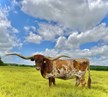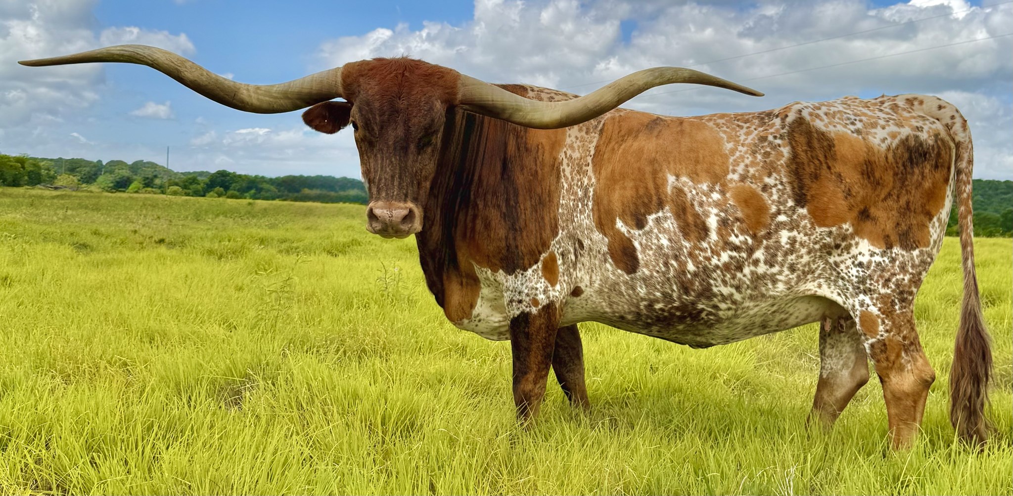 A beautiful Drag Iron daughter just over 90", Dot has the special sauce: twisty sloping horns atop a large sturdy frame. This is the dam of the $275K high seller at 2023 Legends' sale. Seeing her strolling in the pasture is longhorn poetry in motion. That undeniable Drag Iron dot covers her coat with splashy pattern and color. Greatness!!