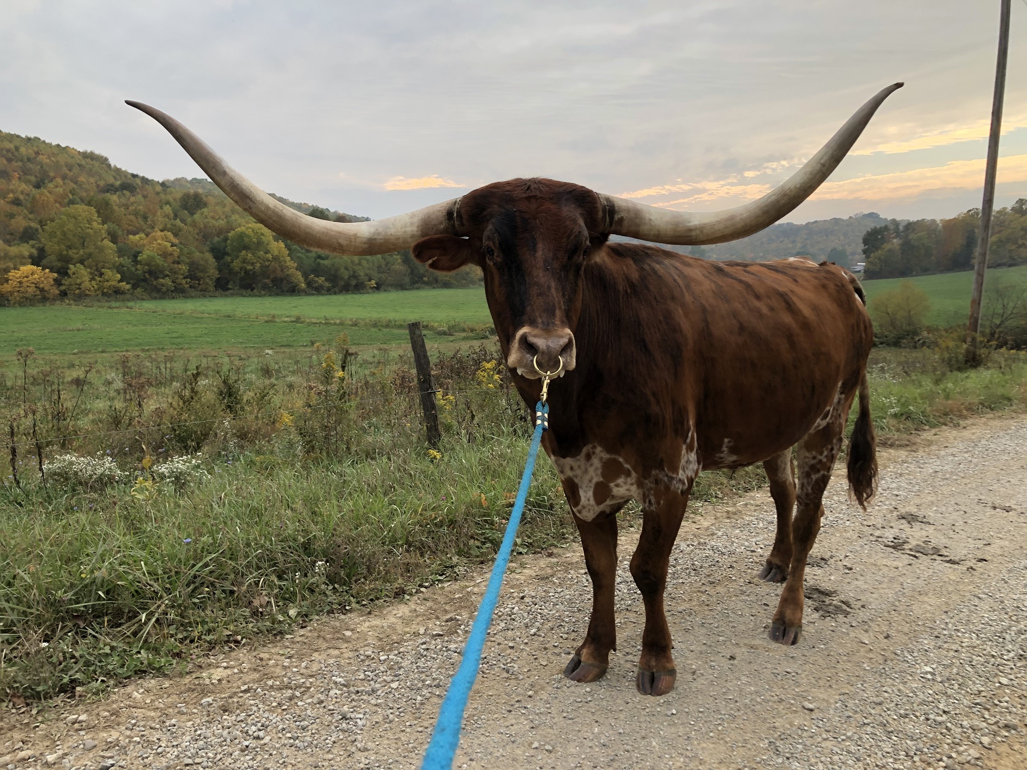 Honcho is an own son of the famous WS Jamakizm, out of a twisty horned Stockton bred cow sired by Over Head. His pretty brindle hide is striking in the pasture and near 100" spread makes him stick out like a sore thumb, well unless he is next to Oreo anyway ;)