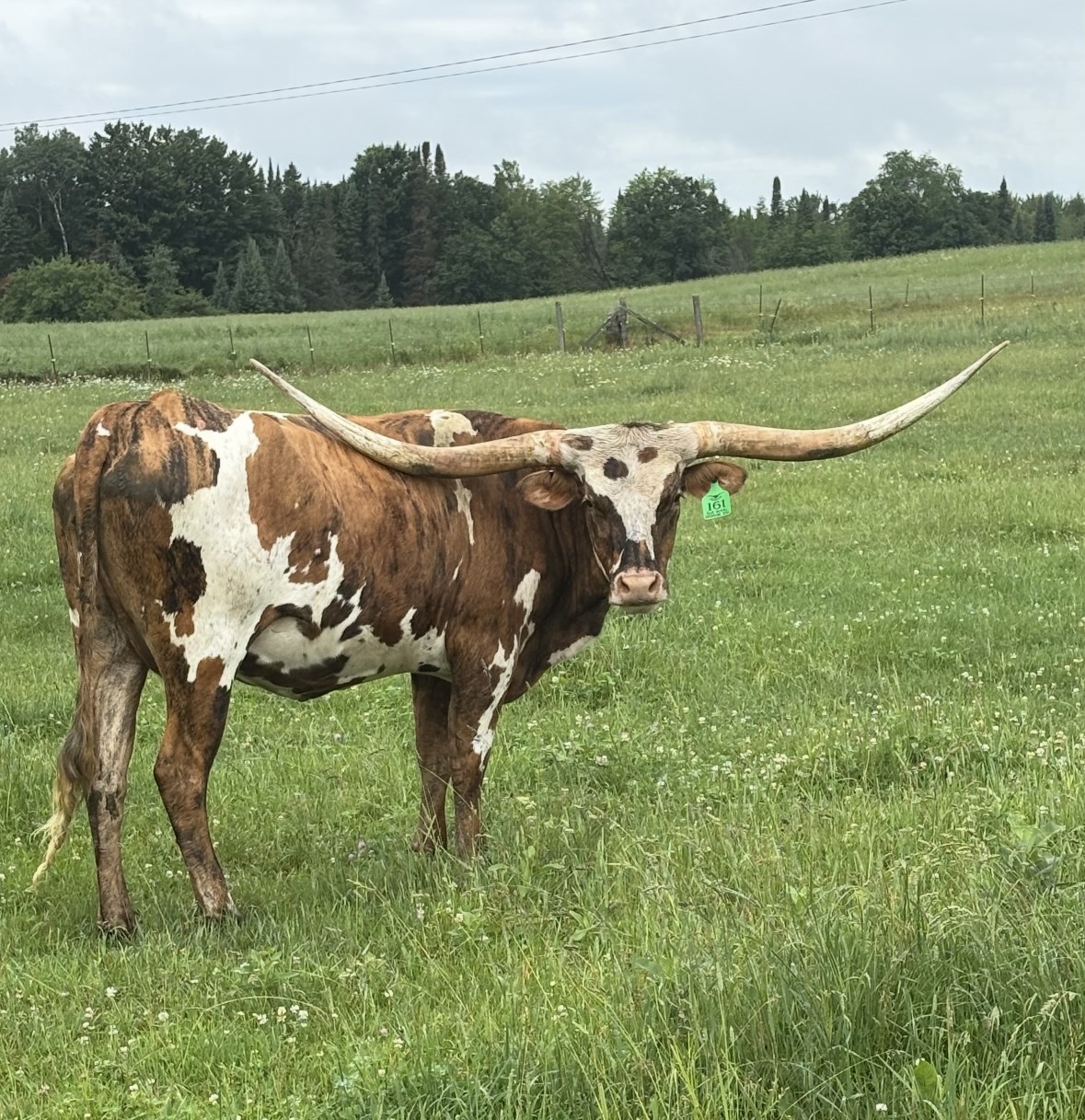 This colorful 3 year old cow is 77''TTT with a horn pedigree of 5 over 90'' and 25 over 80'' TTT . Bulls in pedigree include Cowboy Casanova X2, Cowboy Tuff Chex, Drag Iron and Houdini. Females include Royal Tuffette,HR Rio Rose, HR Slam's Rose and LLL Rosemary.She is very fertile currently bred to Sheridan GLR(MC Hangin' Tuff -102-X Tsunami;'s Tuff Pearl-100'') for an August 2025 calf.