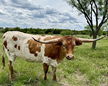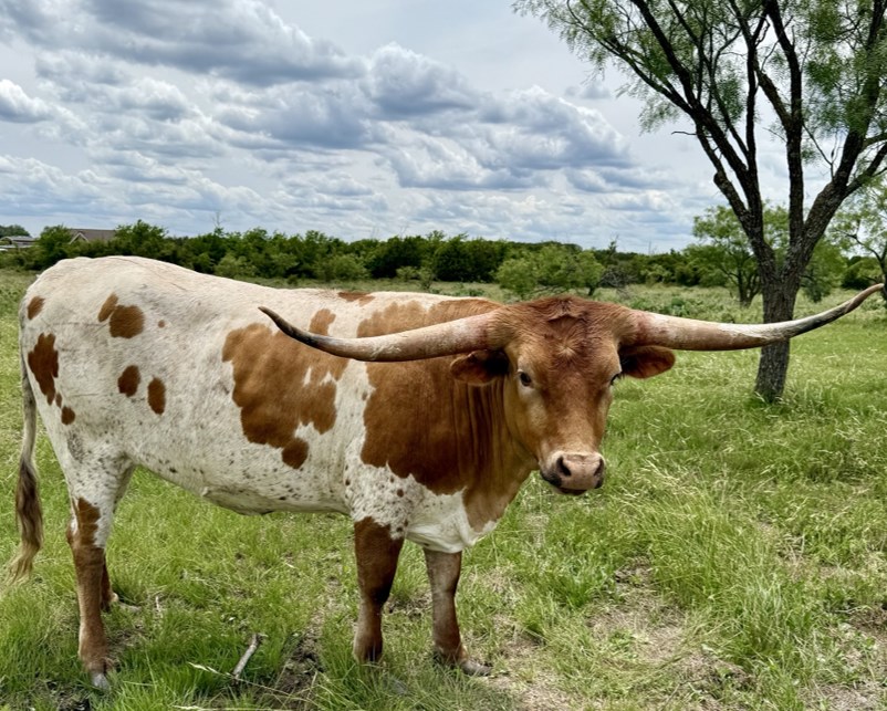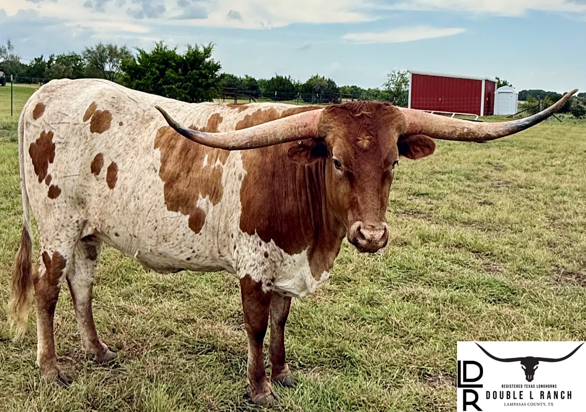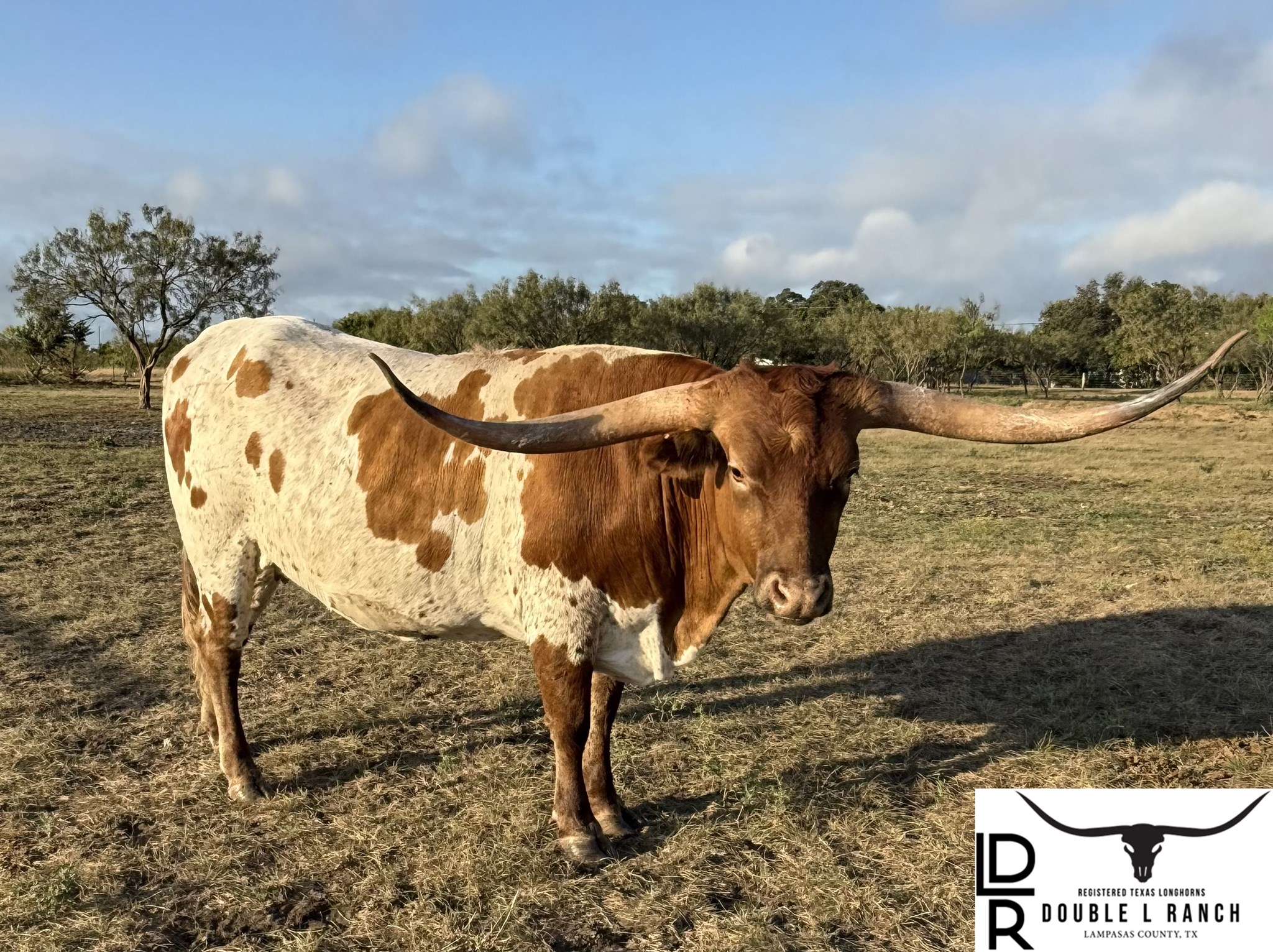 This is a very feminine heifer with an outstanding pedigree. Her sire is a young bull out of a 103"+ TTT dam and a very colorful sire. Her dam is a 20 Gauge daughter with massive swooping horns and the calmest most puppy dog personality you could ask for. This heifer is bred for success. She is compact but we believe that once she hits puberty she will shoot up and look just like her dam. Her horn growth and direction are on track as she progresses.