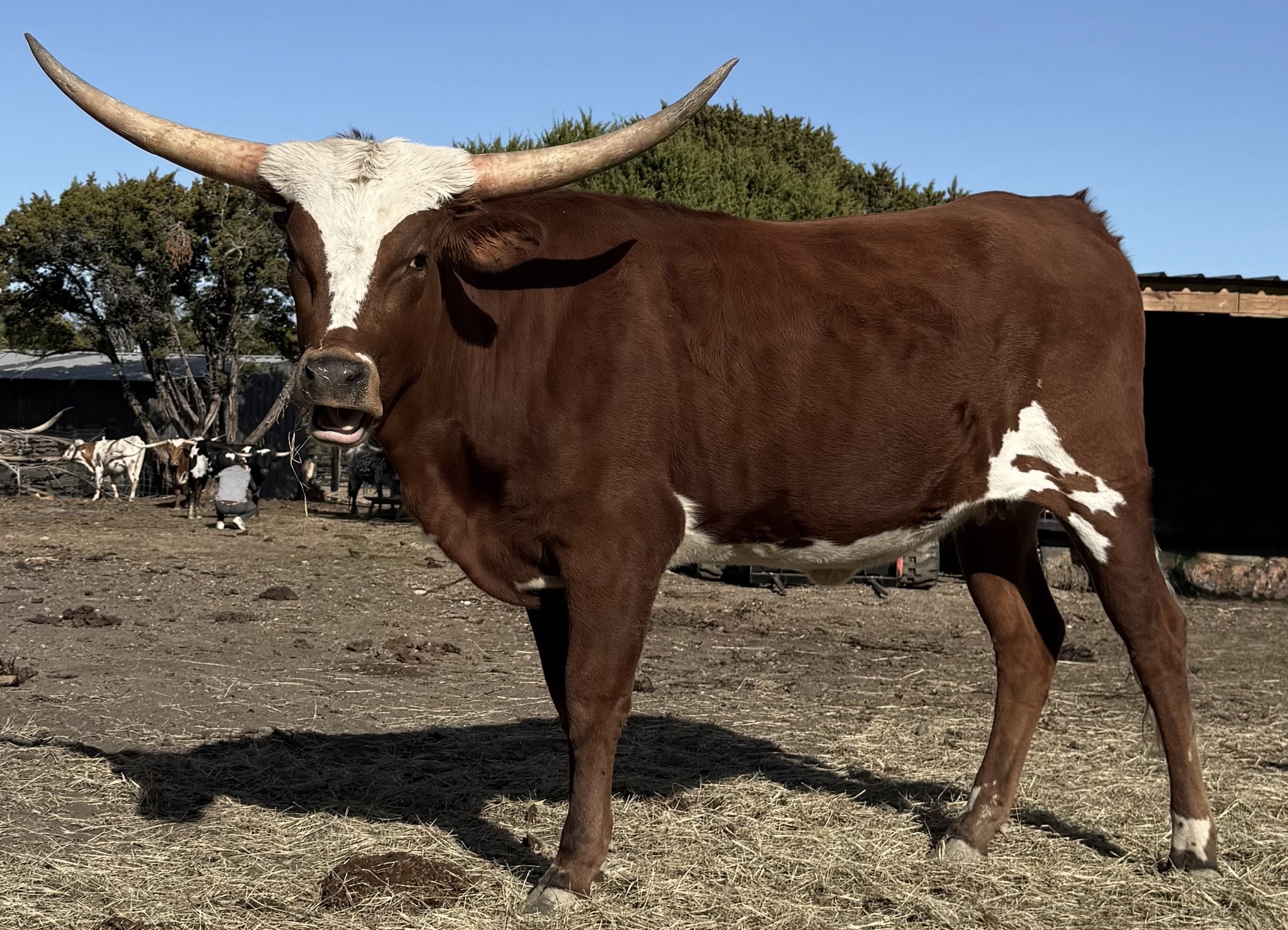 Our girl's outcross sire, Hydro, is one of the greatest color producers in the industry. Boasting a deep wine coat, black nose, black eyelid pigmentation and hooves, all wrapped in a sturdy large frame, Cherry O reflects many traits in her renowned maternal Cherry line. Added bonus: her dam is over 90". .And granddam is over 98" .Cherry O's light horns are growing fast and slanting back....Like mother, like daughter!!
