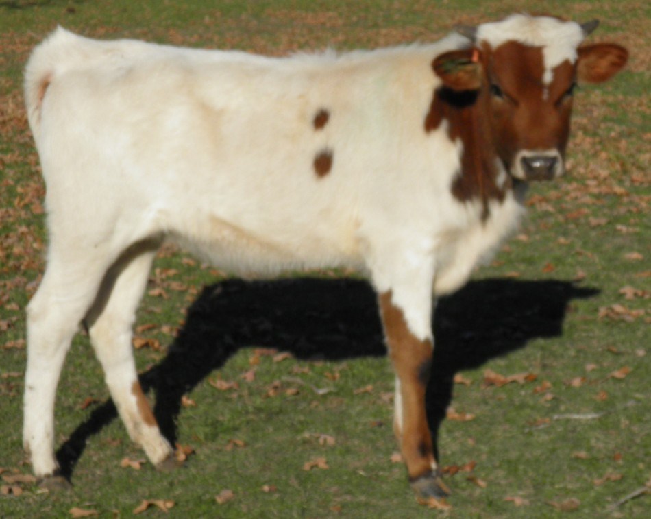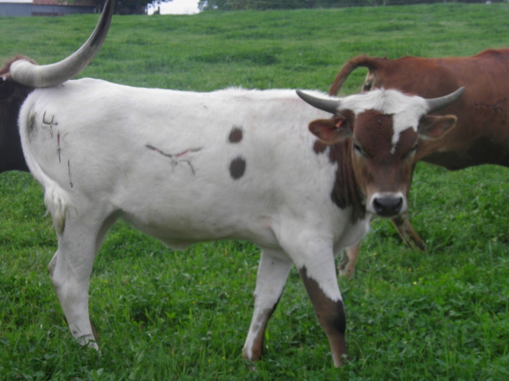 She is a tall thick bodied heifer, starting to show more and more dark specks. Her sire is very near 80" ttt and her dam is 82"+ ttt. Her horns are sweeping back and really coming on.