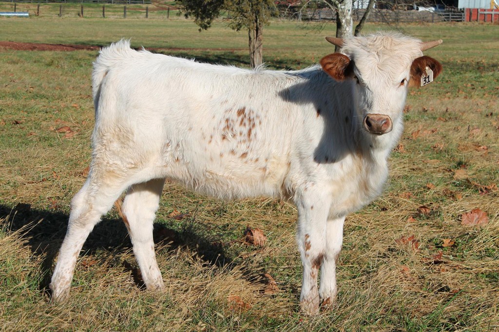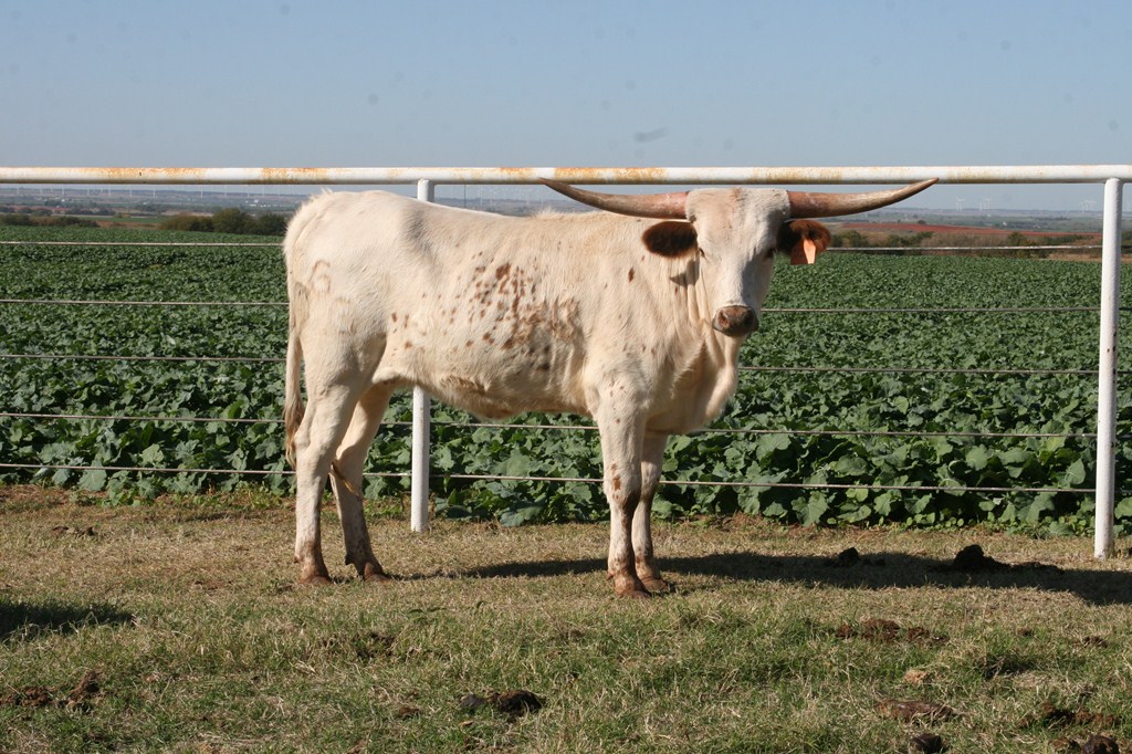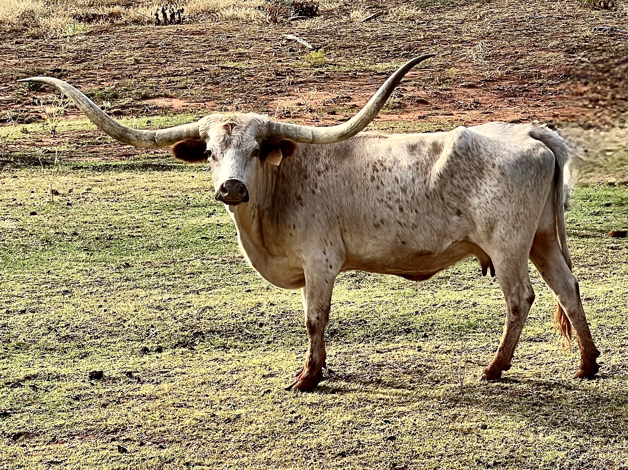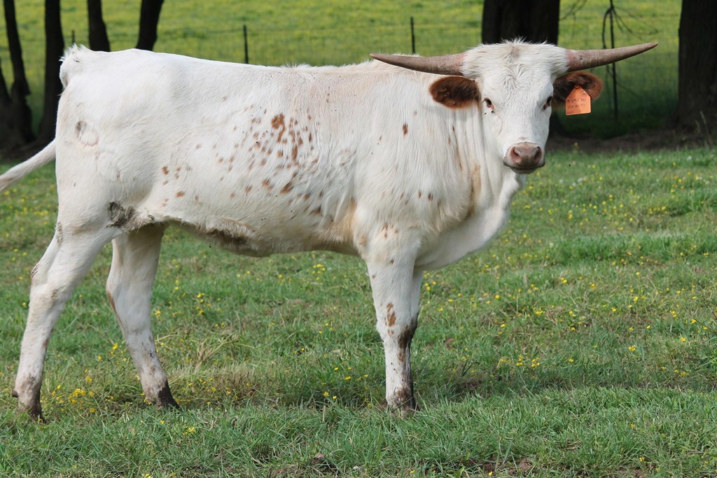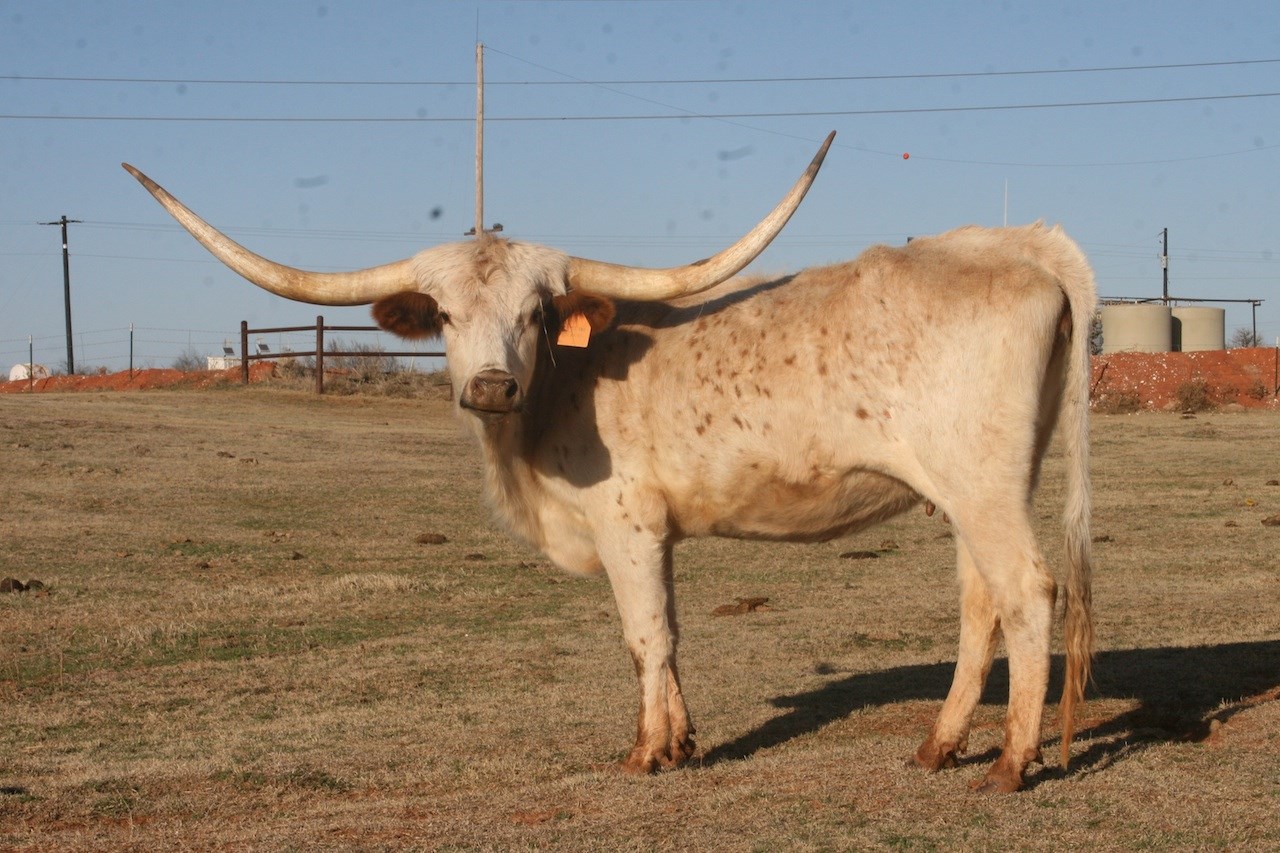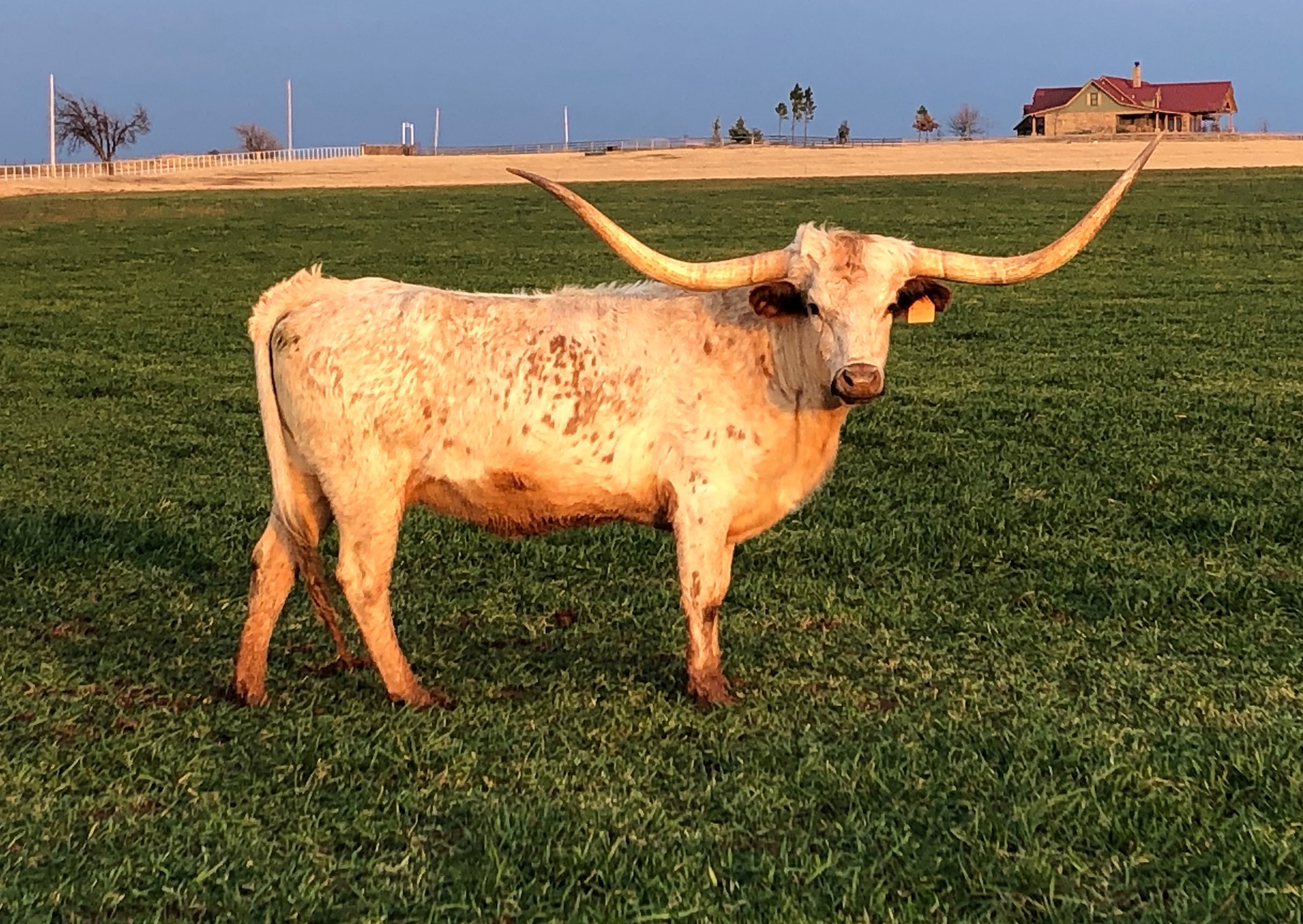 Super colorful young cow with asymmetrical horns. Wonderful personality and mother. Produces great calves. Look at the pedigree - Sittin Bull, JR Grand Slkam, Gunman, Hunts Emperor Exposed to MR CATCH "EM ALIVE JACK a grulla Bull sired by the great PCC Dark Knight