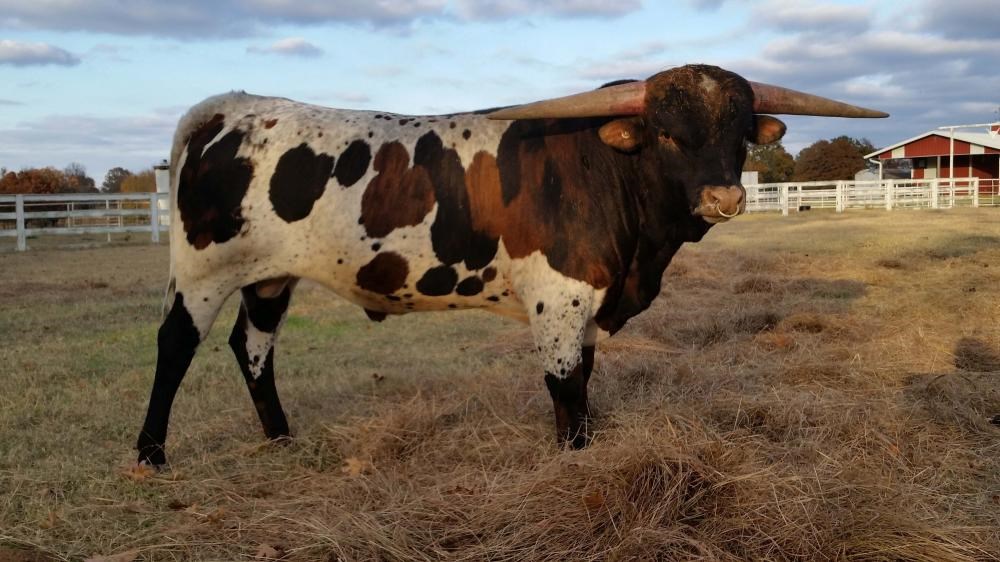 We acquired this exciting young bull at the TLBAA Horn Showcase in October, 2016 from Dr. Gene & Lana Hightower. He was the Millennium Futurity High Point Grand Champion Bull at the TLBAA Horn Showcase Futurity as well as 2016 Horn Showcase Futurity Grand Champion Bull. Besides these illustrious titles, he has already placed 1st at the TLBAA World Show Open in his class; Grand Champion Bull at East Texas State Fair; Grand Champion Bull at State Fair of Texas, and Grand Champion Bull at Louisiana State Fair. His gentle disposition and easy handling is making him quite popular on the ranch. He is now servicing several of our young heifers. RINGO is AI Certified #876 and semen is available. Please call Kyle Mathis at 918-607-1799 for details.